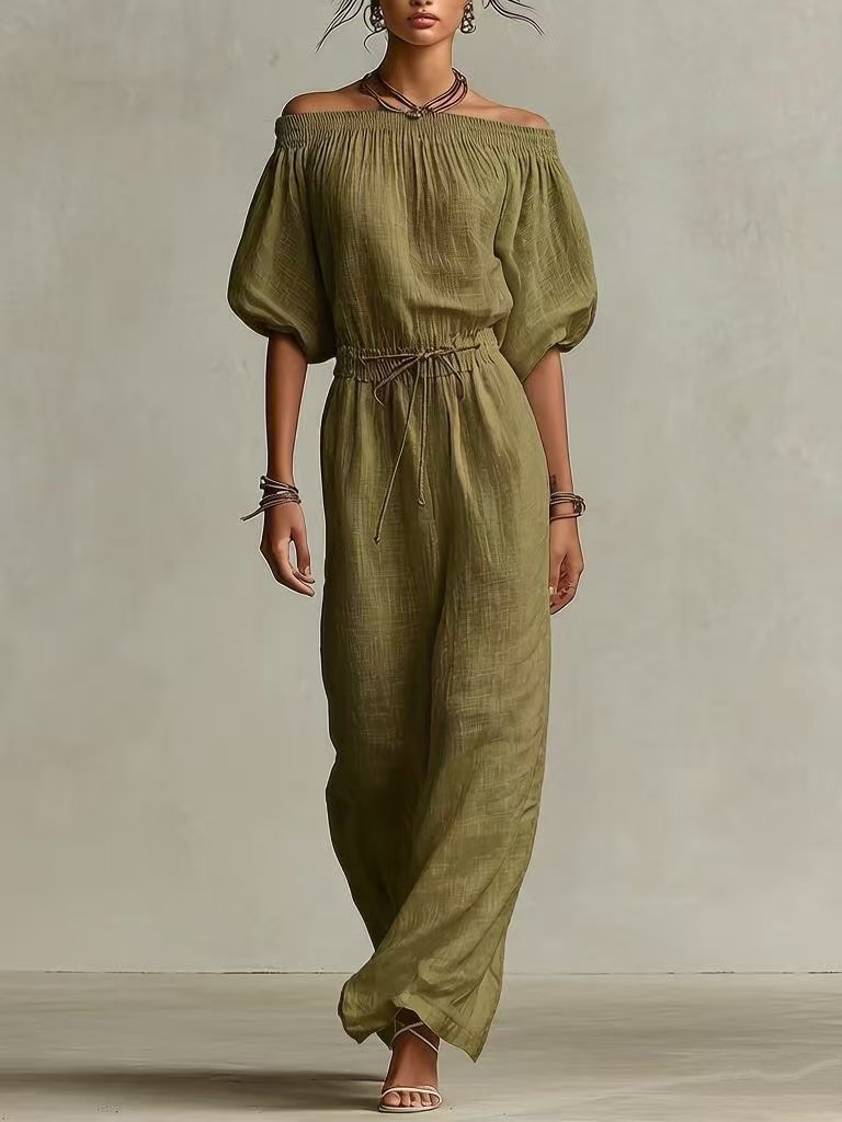 Features: Solid color, lantern sleeves, 3/4 sleeves, full-length pants